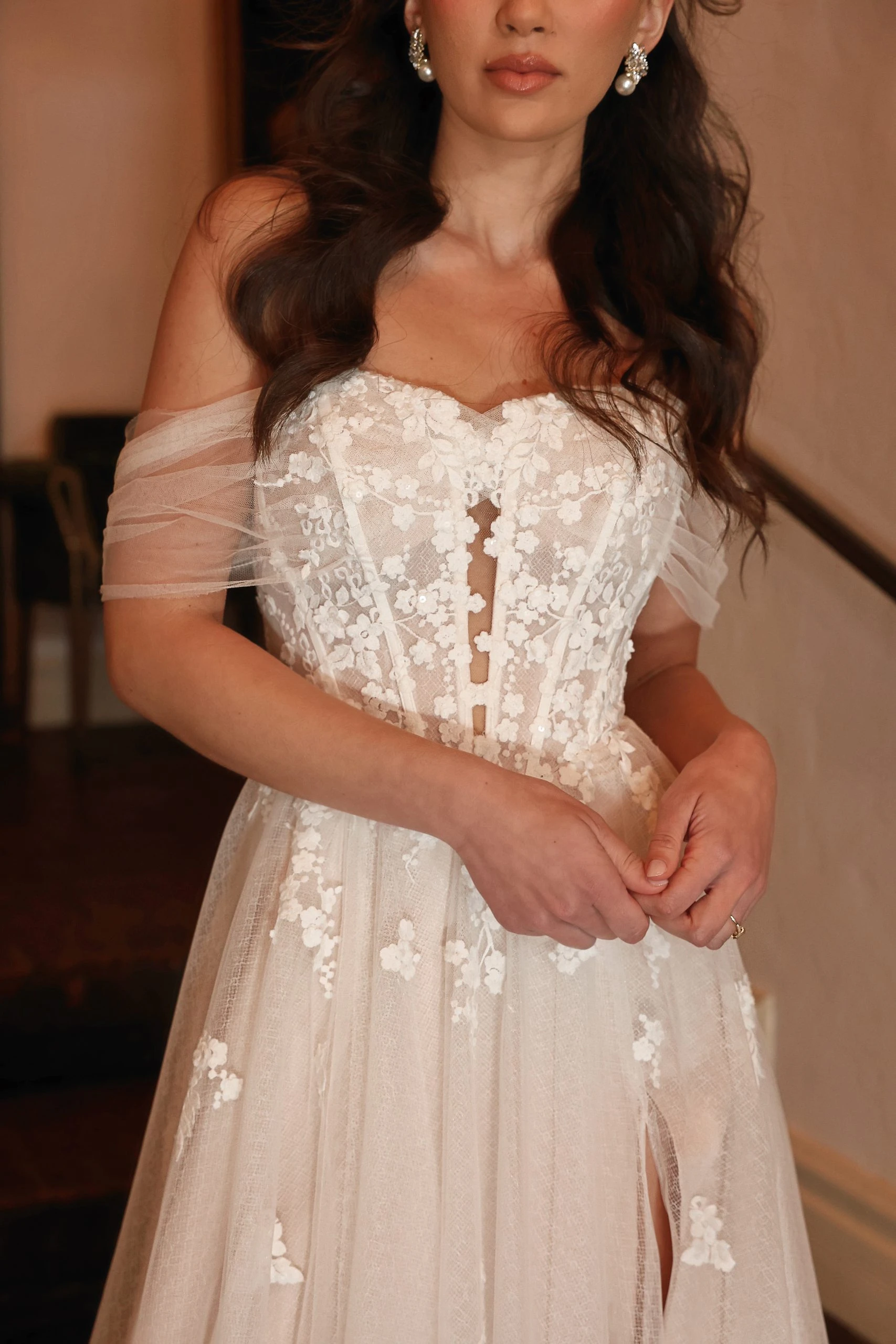 Die korsettartigen Stäbchen des Oberteils aus Allover-Spitze verleihen dem Kleid einen traditionellen Charme, während der dramatische, tiefe Ausschnitt für einen leichten Kontrast sorgt. Abnehmbare, schulterfreie lange Tüllärmel bringen Struktur und Schwung in den romantischen, herzförmigen Ausschnitt.