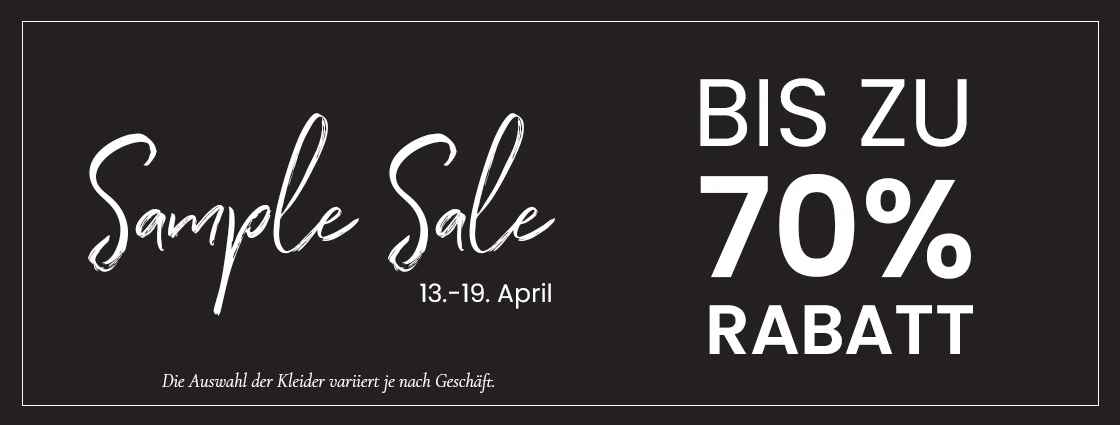 Bitte beachte: Es gibt keinen Rabatt auf das gesamte Sortiment, aber es wird eine große Auswahl an Designer-Brautkleidern im Sample Sale geben.