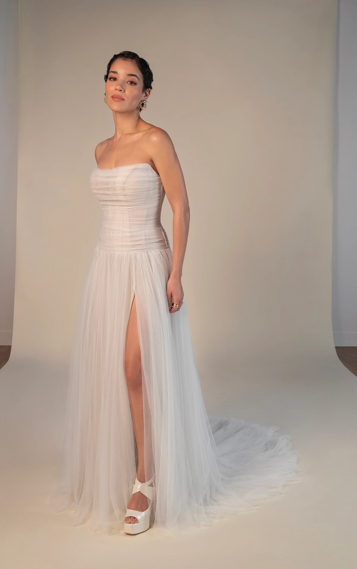 Romantisches trägerloses Brautkleid aus Tüll in A-Linie mit tiefem Taillenbund und hohem Beinschlitz
