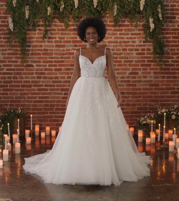 Das Modell D3720 ist wie geschaffen für ein modernes Märchen. Das romantische Prinzessinnen-Brautkleid hat ein halbtransparentes Oberteil mit einem dezenten V-Ausschnitt, der mit schimmernder, floraler Spitze besetzt ist. Die schmalen Spaghetti-Träger sind mit zarten Perlen verziert und verleihen dem Kleid einen subtilen Schimmer. Die Ballkleid-Silhouette schmeichelt jeder Figur, indem sie die Taille formt und in einen vollen Tüllrock ausläuft. Die elegante florale Spitze geht nahtlos über die Hüften und verläuft entlang der langen glitzernden Schleppe. Es ist ein zeitloses, blumiges Prinzessinnenkleid für einen majestätischen Gang zum Altar. Dieses Hochzeitskleid ist auch in Übergrößen erhältlich.