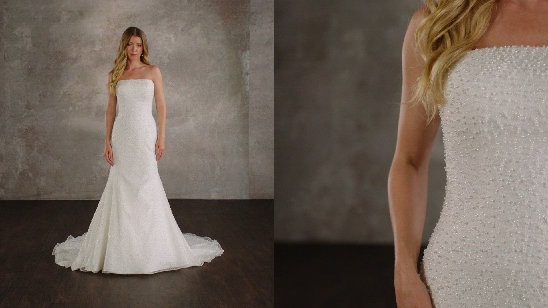 Das Modell D4182 ist mit seinem schimmernden Perlenbesatz, der seine elegante Silhouette vom Ausschnitt bis zum Saum schmückt, der Inbegriff von modernem, sexy Glamour in einem romantischen trägerlosen Fit-and-Flare-Brautkleid für die modebewusste Braut. Ein trägerloser, gerader Ausschnitt führt zu einem taillierten, gefütterten Oberteil, das nahtlos in einen figurbetonten Rock übergeht. Kurz über den Knien weitet sich das Kleid anmutig zu einem eleganten Trompetenrock und schafft so eine atemberaubende Silhouette. Der reich verzierte Perlentüll verleiht diesem einzigartigen, schimmernden Perlenhochzeitskleid einen Hauch von Glanz und Romantik.