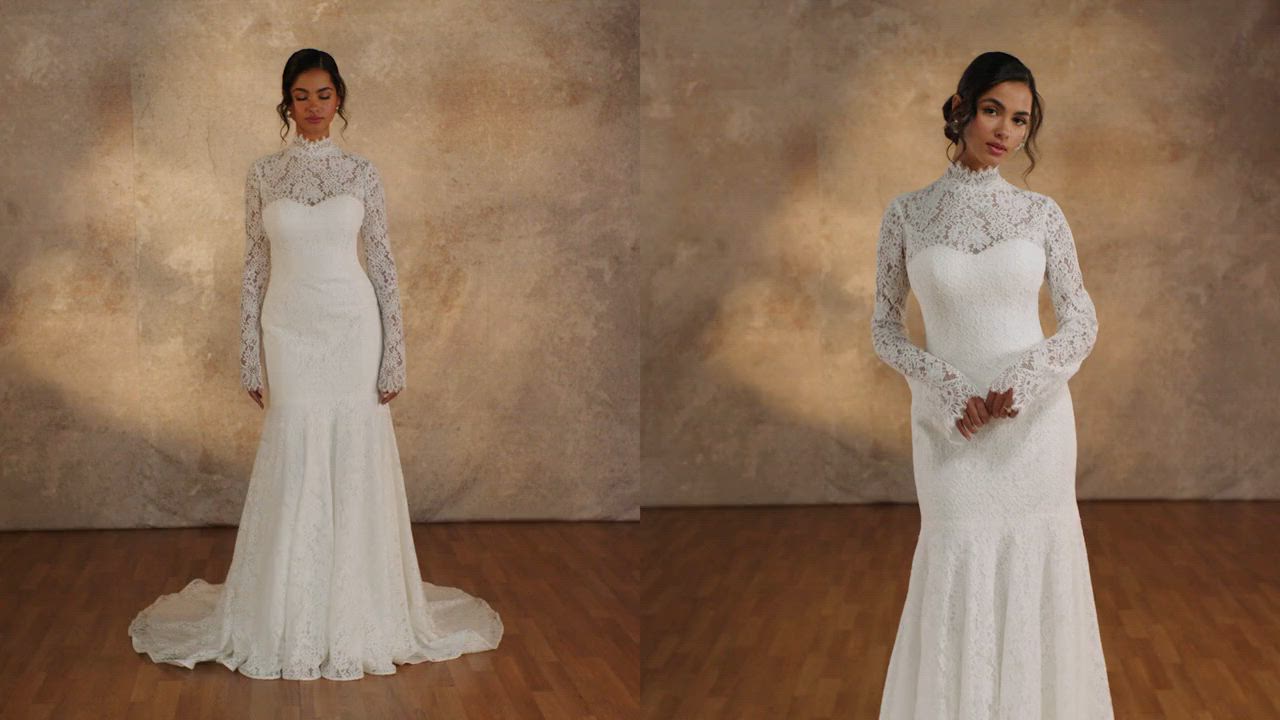 Modell D4455 interpretiert Vintage-Eleganz auf moderne Weise und überzeugt mit einem figurbetonten Design aus durchgehender Spitze. Der hohe Ausschnitt und die transparenten langen Ärmel sorgen für eine elegante Bedeckung und bewahren gleichzeitig die romantische Ausstrahlung des Brautkleides. Das verlängerte Oberteil geht nahtlos in einen Fit-and-Flare-Rock über und vereint klassischen Charme mit zeitgemäßer Raffinesse. Ideal für die Braut, die sich einen zeitlosen Look mit kunstvollen Details und stilvoller Raffinesse wünscht. Erhältlich in Übergrößen.