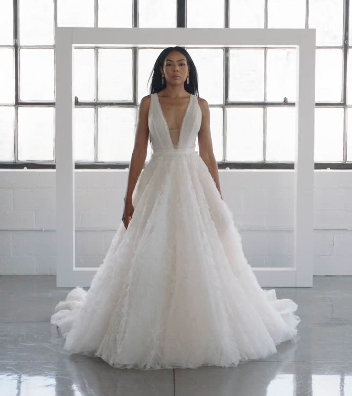 Eine himmlische Verkörperung von Braut-Eleganz: Modell 1531 vereint in diesem spektakulären Hochzeitskleid alle zarten, luxuriösen Details der Haute Couture. Von den breiten Schulterträgern geht das geraffte Tüll-Oberteil in einen schmeichelhaften tiefen Ausschnitt über, der mit nudefarbenem Illusionstüll ausgekleidet ist und bis zur Taille reicht. Ein luxuriöser Ballkleidrock aus federleichtem, strukturiertem Tüll fällt von der Taille ab und sorgt für einen voluminösen und zugleich sanften Effekt. Dieser extravagante Brautlook wird durch eine dramatisch lange Schleppe und einem subtilen Glanz, der vom funkelnden Tüll der Unterschicht hervorgeht, vervollständigt.