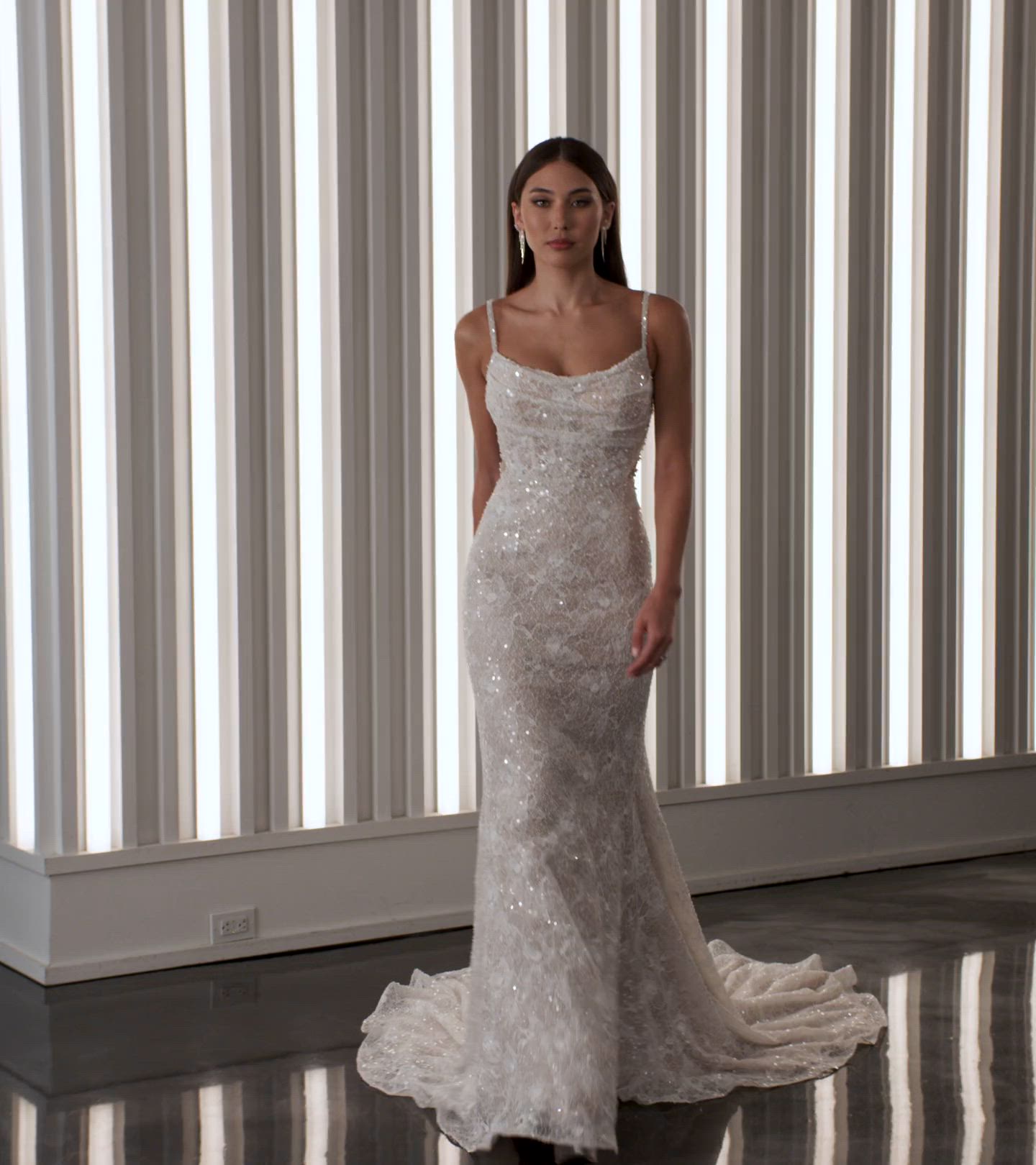 Das Modell 1697 sorgt mit seiner beeindruckenden enganliegenden Silhouette für einen atemberaubenden Auftritt. Es ist mit strahlender Spitze verziert, die aus jedem Blickwinkel schimmert. Dieses Kleid hat elegante Spaghetti-Träger, die von einem sanft gerundeten Ausschnitt herunterfliessen und mühelos über die Oberweite drapiert werden, um die Figur zu betonen. Verführerische seitliche Cutouts treffen auf einen perlenverzierten, tiefen Rückenausschnitt, der die sanften Raffungen an den Hüften des taillierten Etui-Rocks hervorhebt. Dieses sexy enganliegende Hochzeitskleid, das bei jeder Bewegung Raffinesse und Glamour ausstrahlt, ist ein echter Blickfang.