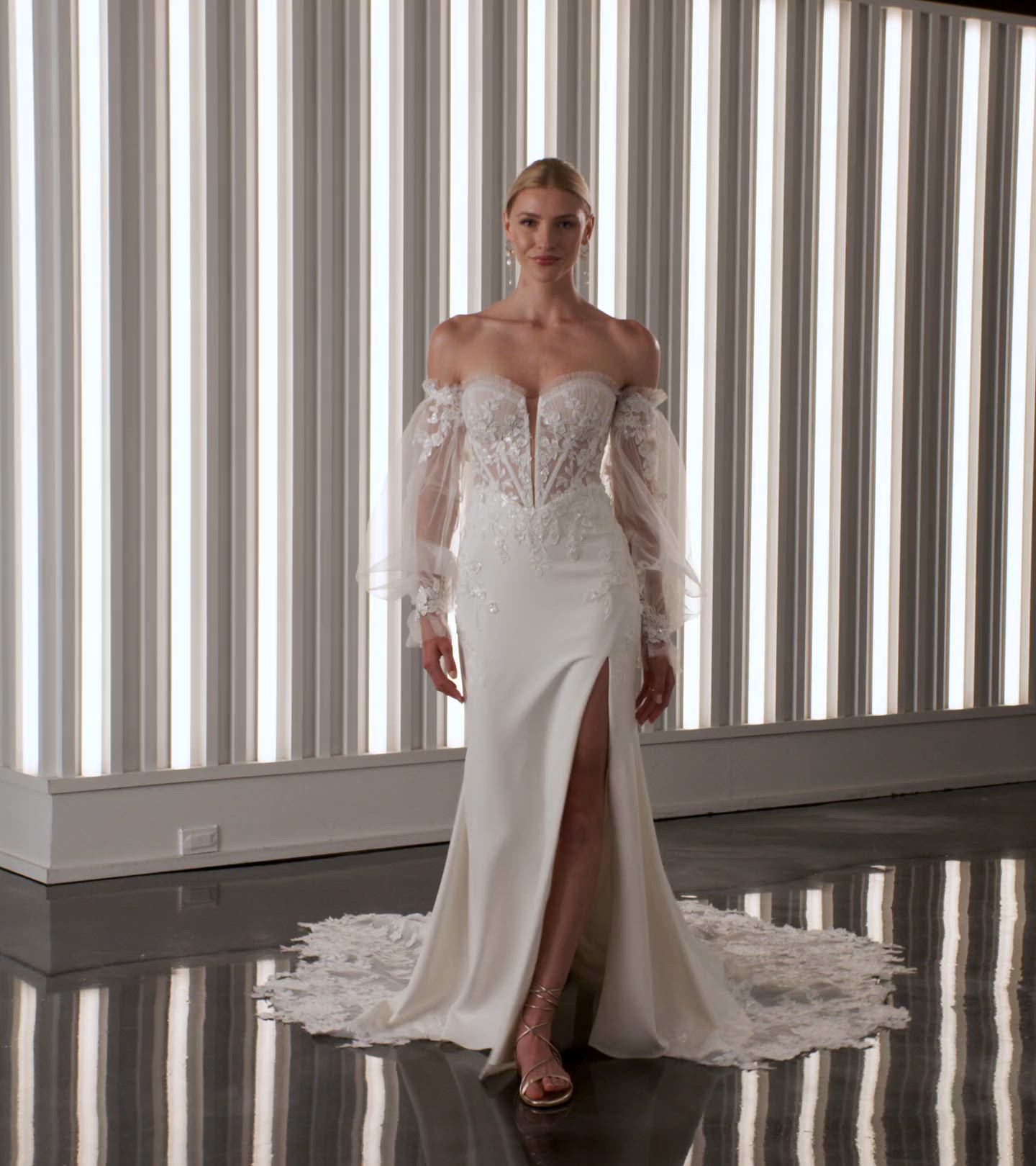 Lass Dich von diesem sensationellen Brautkleid im Meerjungfrauen-Stil verzaubern. Das trägerlose Oberteil mit herzförmigem Ausschnitt enthüllt einen Hauch von Eleganz und zarte Korsettstäbchen unter transparentem Tüll, der mit sorgfältig platzierten Spitzenapplikationen verziert ist. Das Dekolleté ist geschmackvoll tief ausgeschnitten und wird von plissiertem Tüll umrahmt, der dem Kleid einen traumhaften Touch verleiht. Die abnehmbaren, schulterfreien Blouson-Ärmel mit zierlichen Spitzenbündchen sind mit stoffbezogenen Knöpfen im Vintage-Stil verziert und damit ein vielseitiges und zeitloses Accessoire. Spitzendetails rahmen die Silhouette anmutig ein und betonen die Hüften, während ein optionaler Beinschlitz für modernes Flair sorgt. Das Tüpfelchen auf dem i ist die bezaubernde Cutout-Schleppe aus Spitze, die diesem romantischen Brautlook ein atemberaubendes Detail verleiht.