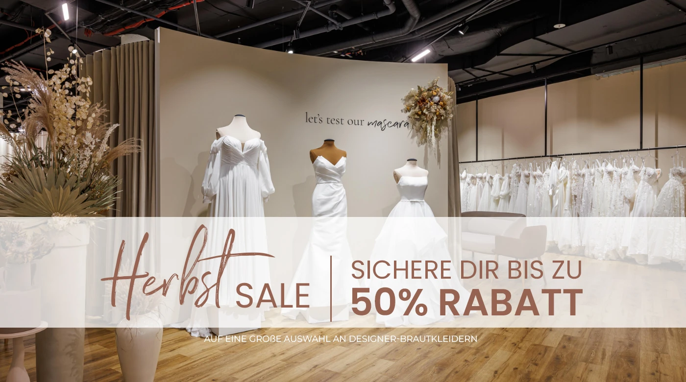 Der Herbst wird noch schöner! Während unseres Herbst Sales vom 7. bis 25. Oktober erwarten Dich ausgewählte Designer-Brautkleider mit bis zu 50 % Rabatt – schon ab 599 €.