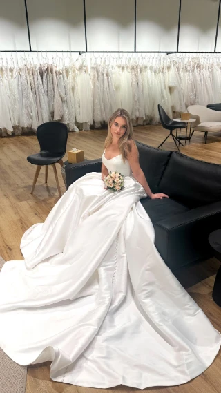 We know that shopping for a wedding gown is a once-in-a-lifetime experience, and finding your dream dress should be a memorable moment shared with your closest family and friends. We would love for you to bring whoever’s opinions you value and trust the most, and recommend calling your local store to inquire about the maximum number of guests allowed at your appointment. We ultimately want you to feel confident and gorgeous when you stand in front of the mirror in one of our gowns, because we think every bride should experience the pure joy of finding their dream dress with the people they love by their side.