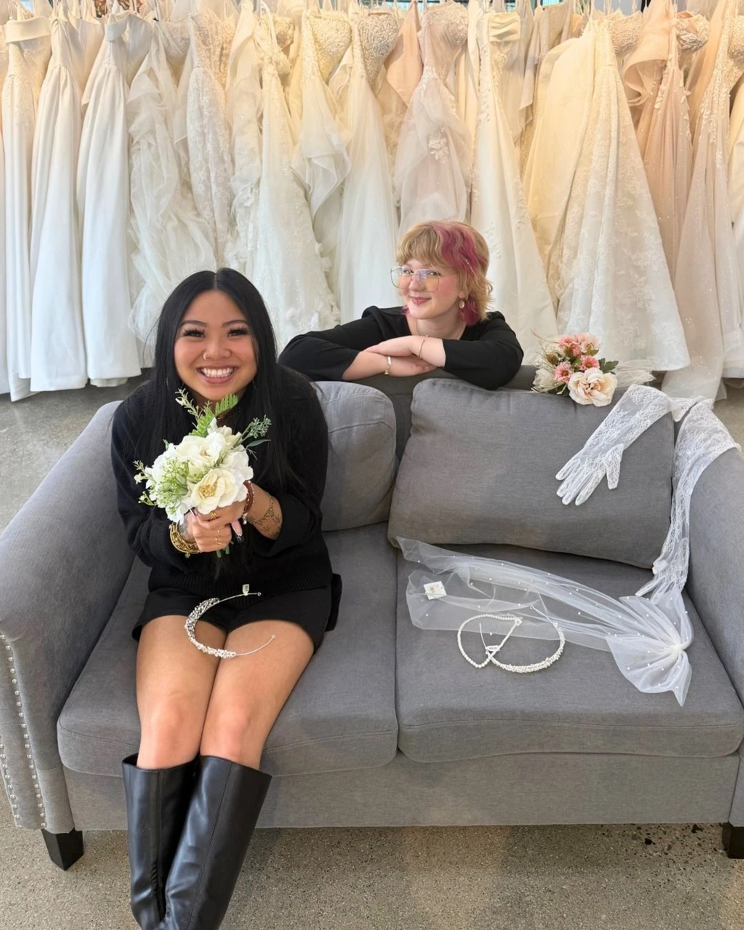 Yes! From veils to bridal jackets, jewelry, belts and hair accessories–we offer a wide variety of bridal accessories to pair with any wedding dress you choose. We have everything you need to create a personalized wedding day look to complement your personal style, and our stylists are happy to help you choose the right accessories for your wedding dress at your appointment.