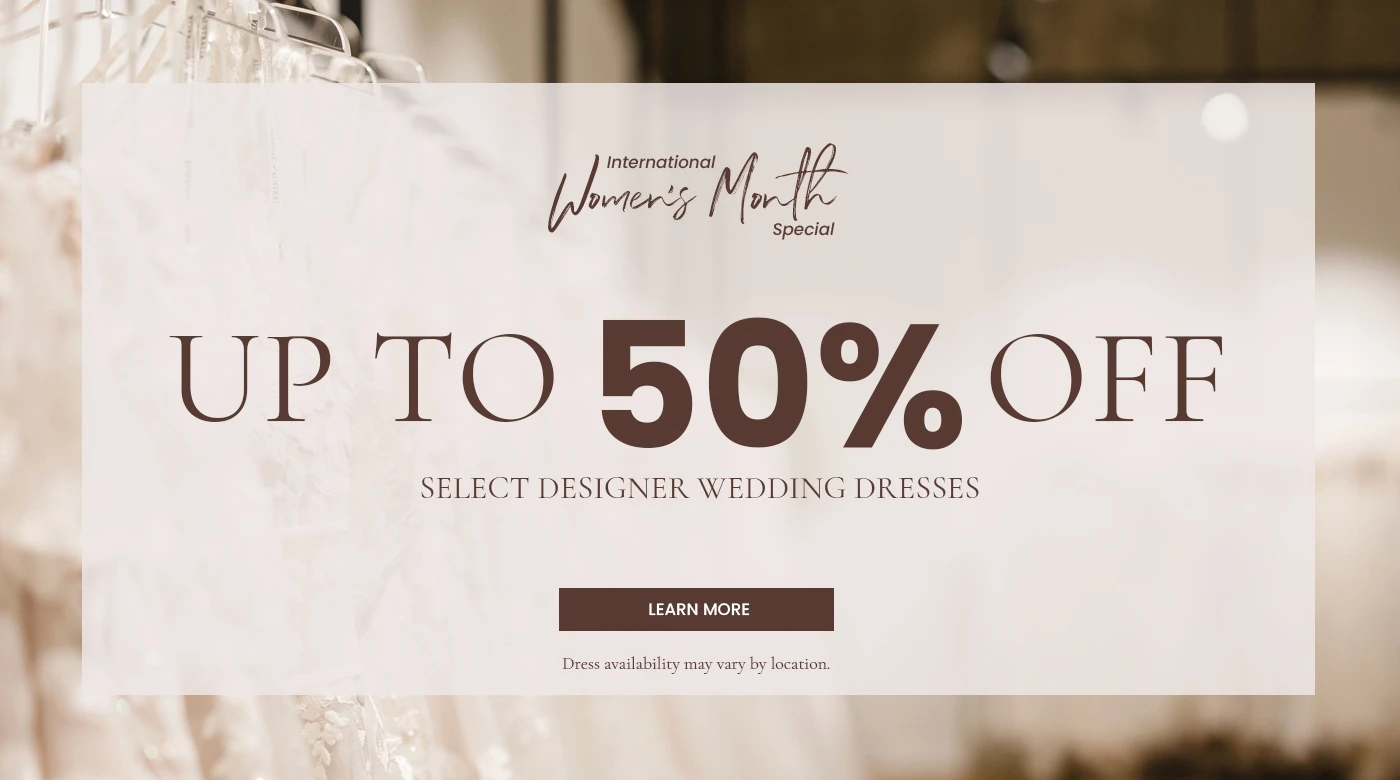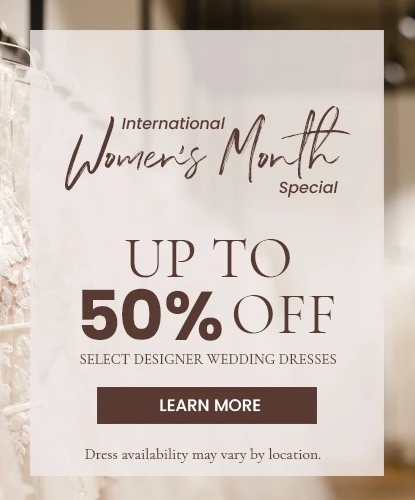 3. – 21. March, celebrate International Women’s Month with up to 50% off select designer gowns (starting at €599) and 20% off special orders.