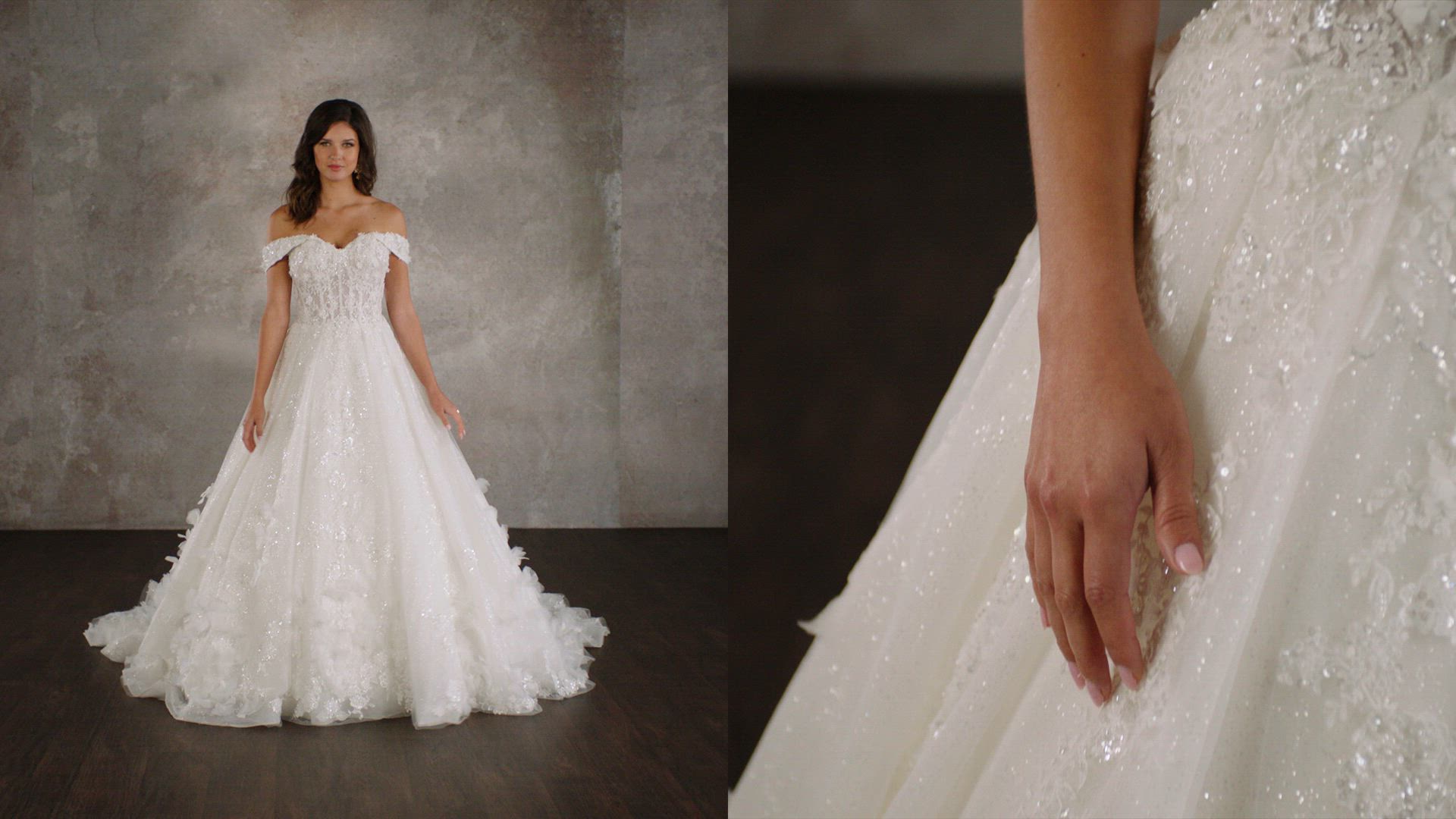 Style D4112 is the ideal blend of romance and modern elegance for the fashion-forward bride. This captivating off-the-shoulder ballgown features detachable straps that elegantly frame the sweetheart neckline, leading into a sheer corset-fit bodice that is richly adorned with three-dimensional floral lace. The back reveals a stunning illusion lace design, enhanced by a delicate row of fabric-covered buttons. A voluminous glitter tulle skirt flows from the waist, creating a timeless ballgown silhouette, while shimmering floral lace accents and 3D floral details along the train add a touch of enchantment. This wedding dress is a true vision of romance and sophistication.