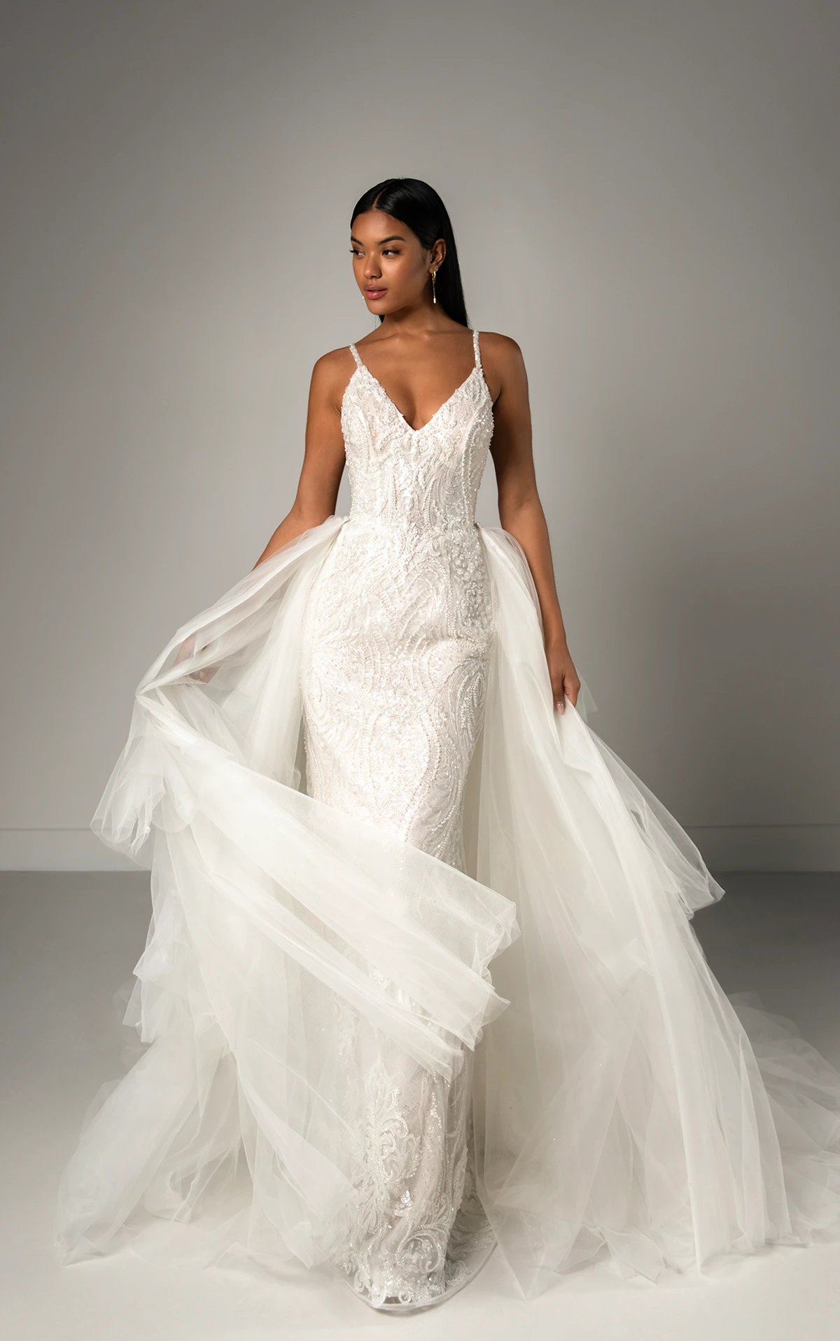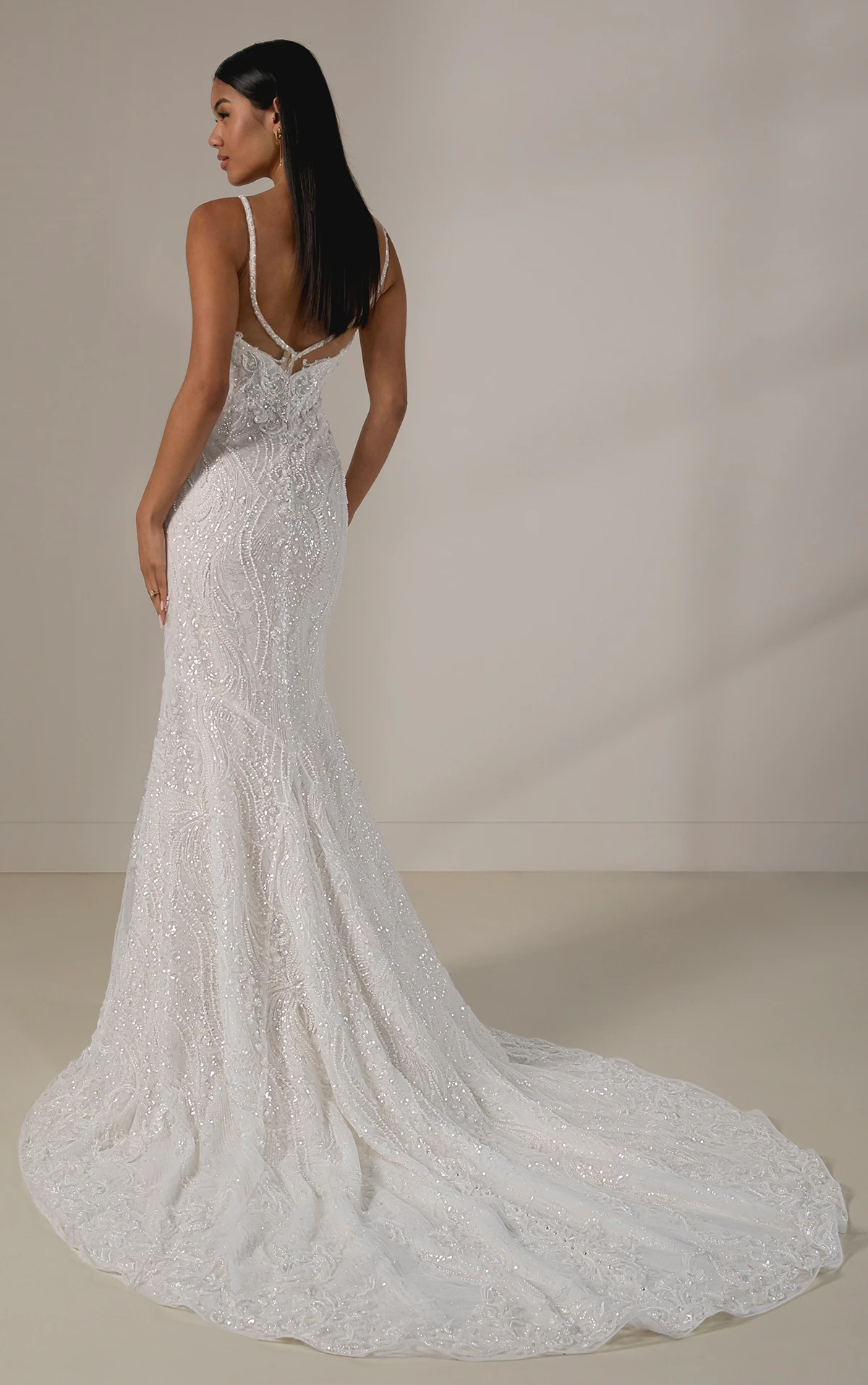 Sophisticated glamour, Style LE1425 combines timeless luxury with modern allure in an allover lace wedding gown, meticulously handcrafted with couture details. Shimmering beaded spaghetti straps lead to a classic V-neckline, showcasing an impeccably fitted bodice and sleek column silhouette. The open back, framed by the spaghetti straps, adds a touch of refined elegance. Glamorous scrolling beadwork over glitter tulle creates a stunning effect, evoking the timeless beauty of art deco wedding gowns, while the column silhouette sparkles with intricately beaded lace. The look is completed with a sweeping train, and brides can elevate the design further with an optional detachable tiered tulle overskirt, adding volume and length for a bold, fashion-forward bridal statement.