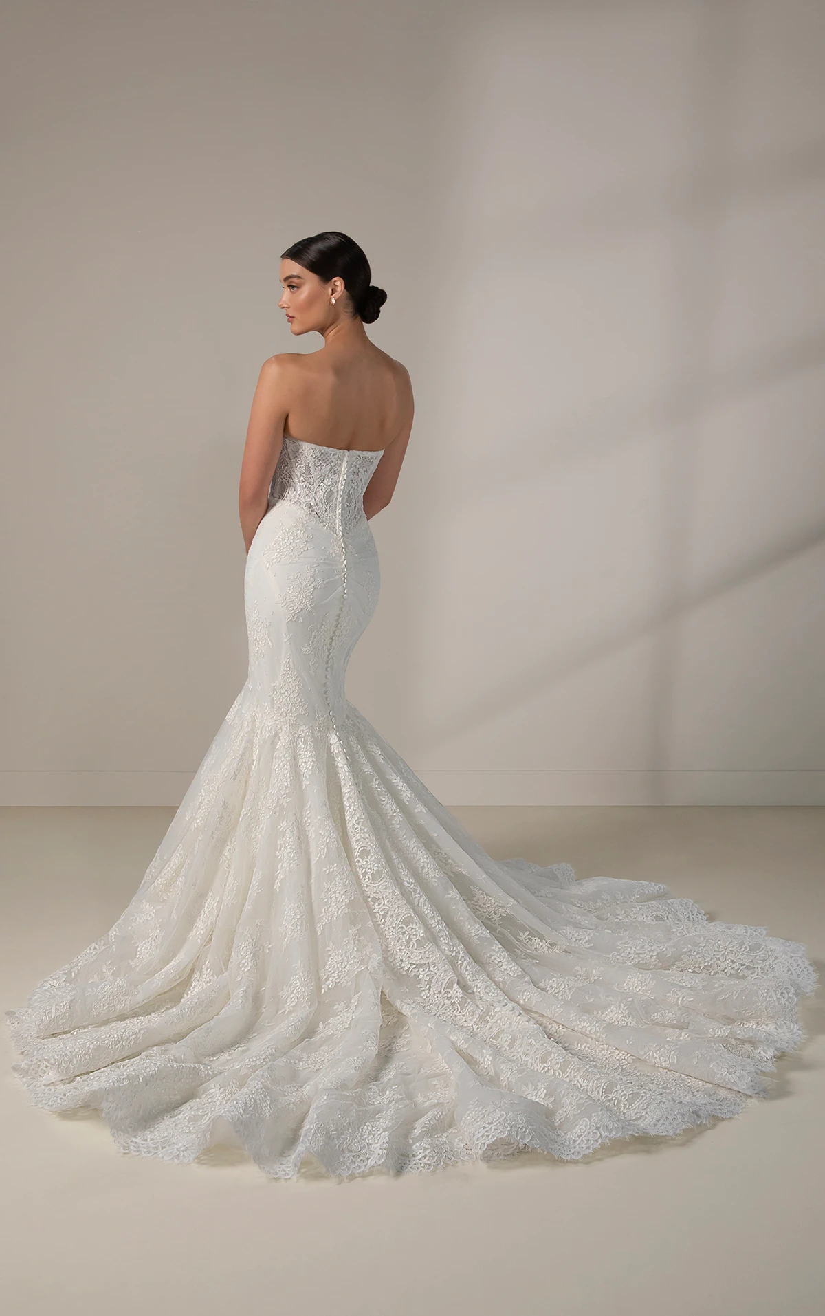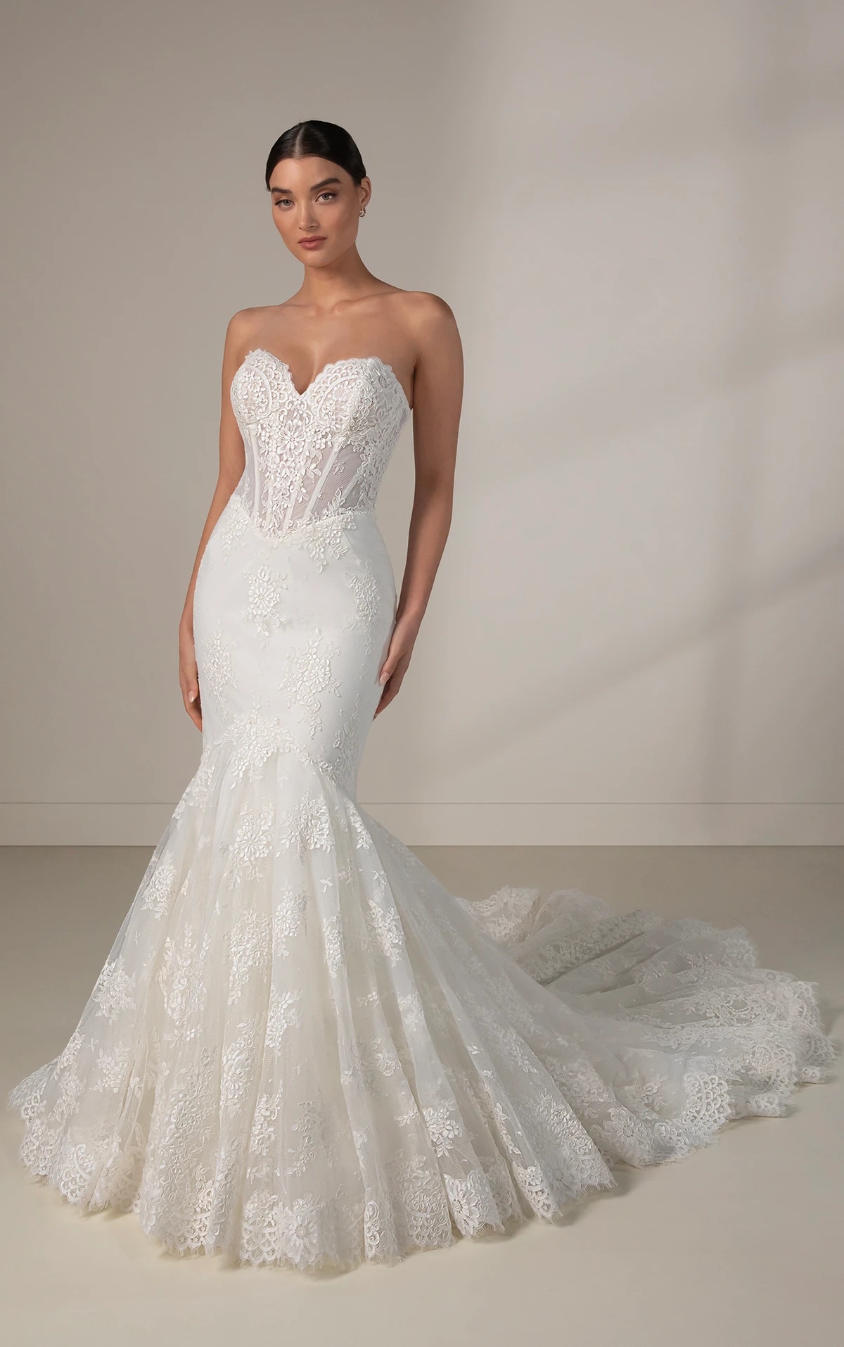 This breathtaking fit-and-flare wedding gown combines sultry appeal with romantic elegance. Featuring a strapless sweetheart neckline, Style LE1427 showcases a beautiful allover matte floral Chantilly lace that wraps the figure in luxurious detail. The detachable off-the-shoulder lace sleeves, flaring at the wrist, add an ethereal, delicate touch. The fitted bodice offers a customizable look, with options for a lined or sheer unlined fit, creating a flattering and seductive shape. From the basque waistline, the lace continues to contour the hips, flaring above the knee into a voluminous pedestal skirt, allowing the bride to glide down the aisle with effortless grace.
