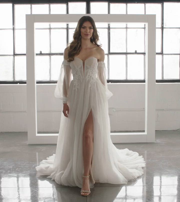 Get swept away with Style 1540, an enchanting wedding dress of delicate sheer tulle and lovely lace appliqués. Sheer off-the-shoulder sleeves are cuffed in floral lace at the upper arm and wrist for a whimsical and weightless look that perfectly complements the ruched tulle textures of the strapless sweetheart neckline bodice. Organically embellishing the bodice and upper skirt, subtle lace appliqués highlight the figure and blend the structured bodice with the free-flowing A-line skirt of textured pleated tulle. For a modern and demure touch, a high side slit opens the skirt to complete this elegant and ethereal wedding dress.